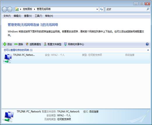6. 连接成功之后,可以在“网络共享中心”-- “管理无线网络”看到添加了相应的无线配置文件。