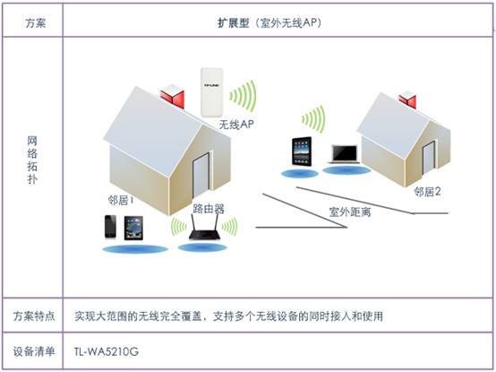 针对室外邻居网络共享,使用室外无线AP达到网络覆盖。