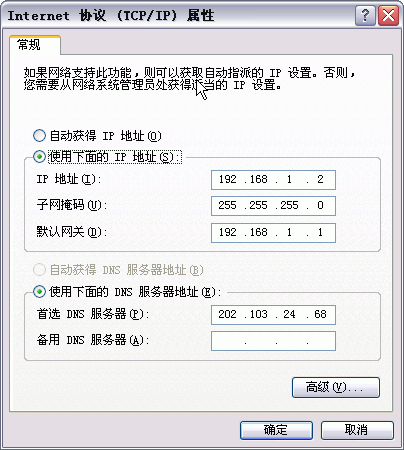 第一步:设置本地连接,给本机设置一个IP,从192.168.1.2~192.168.1.254都可以,网关和DNS都是192.168.1.1,或者DNS可以加一个湖北的DNS服务器:202.103.24.68;