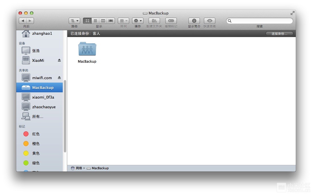 7、连接完成之后可以看到MacBackup备份盘,如果出现此磁盘,则代表设置正确,可以进行下一步操作,如果没有,请检查上面的步骤是否有错,重新操作。