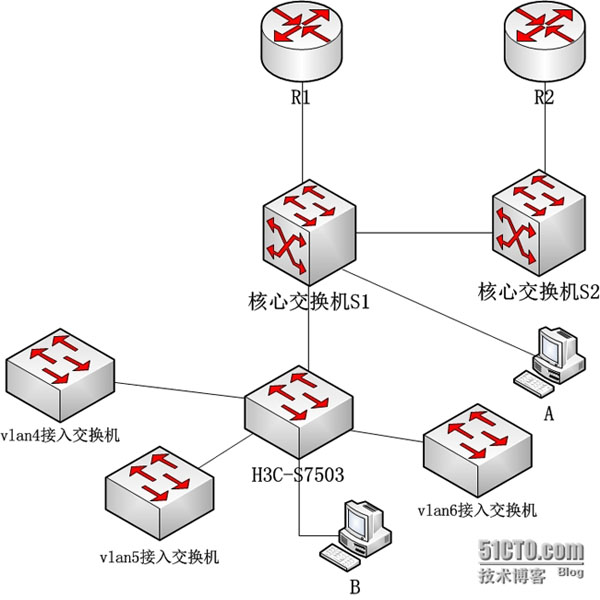 网络结构相对简单,办公网内主要有vlan 3 vlan4vlan5 vlan6,营业厅主要vlan 3,过去整改XX单位的办公内网全部通过H3C 7503连接,核心S1和75之间通过trunk口进行互联配置;在核心交换机设置了vlan地址,考虑网络高可用性,使用了virtual-ip,S1的vlan3地址为60,s2的vlan3地址为61,他们的虚拟地址为62,因此vlan3下面的机器的网关都设置为62,其他的vlan也是同样;
