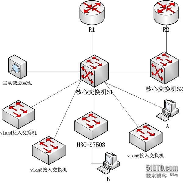 为了排除故障,首先做了分析,判断网络环路和病毒ARP可能性较高,在核心交换机上部署了主动威胁发现设备,并将做了端口镜像,就是将75和接入交换机的数据复制一份到S1的g1/0/30,g1/0/30接主动威胁发现设备数据口。