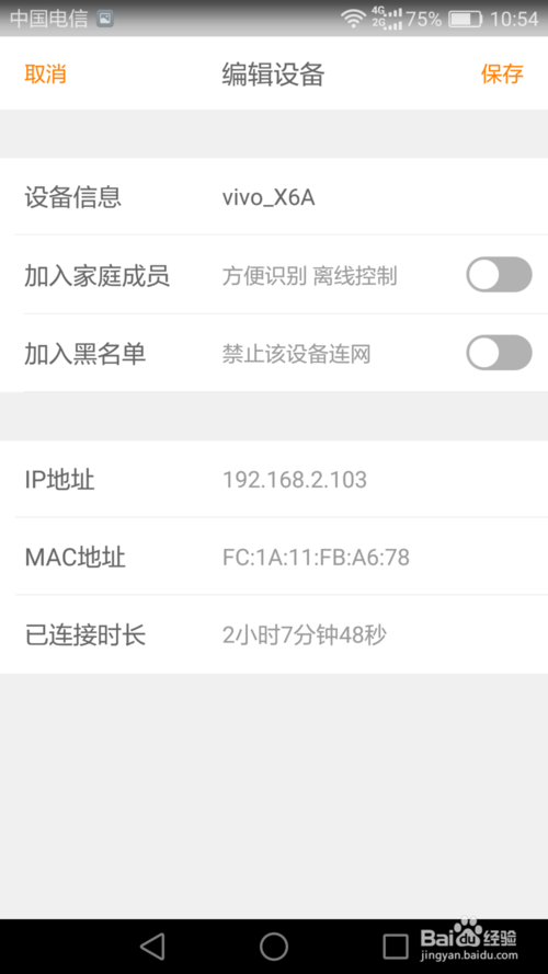 在斐讯路由app的防蹭网中我们可以查看陌生设备和家庭设备,点击其中一个可以进入设置将其加入家庭设备、黑名单等。