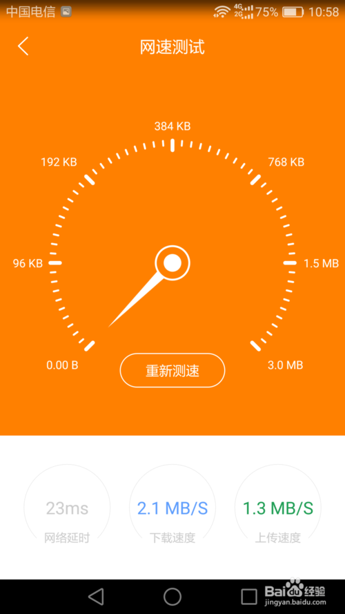在斐讯路由app的网速测试中点击可以测试自己的网速,点击开始测速以后稍等就可以看到自己网络的延时和上传下载速度了。