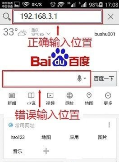一些手机上的电脑浏览器,开启后的首页有一个非常大的输入框(百度搜索、360、UC等)。很多人是在输入框中输入的falogin.cn,其結果肯定是登陆不上falogin.cn网页页面的;由于在电脑浏览器中输入falogin.cn的部位是不正确的,这一不正确很多人都是犯。