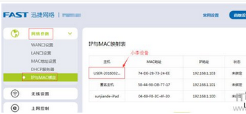 2、在高级设置网页页面,点一下左侧的“互联网技术基本参数”——>“IP与MAC地址关系”,接着在右侧的文件目录中找寻“小李”的设备名称。
