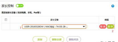 3、明确好小李所运用机械设备的姓名后,点一下左侧“上网操纵”——>“爸爸妈妈操纵”。在右侧提示框中“开启”家中操纵功效,接着点一下下面的“再加”,选择小李的设备名称,点一下“存储”。