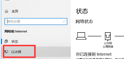 2、在网络和internet窗口左侧找到“以太网”选项并点击。