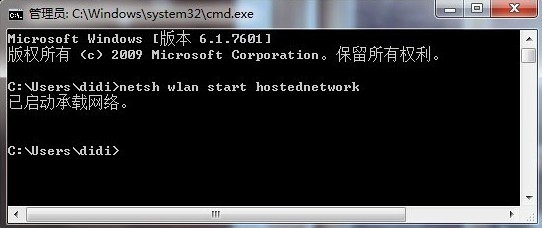接下来,在命令提示符中运行:netsh wlan start hostednetwork,从而开启激活无线网络。