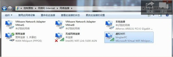 确定你的无线网卡有这个功能后,开始启动virtaul wifi,同样是命令行netsh wlan set hostednetwork mode=allowssid=Windows7AP key=password (ssid是将来无线连接的名字和password就是密码了【8位以上】,大家可以设自己习惯的ssid,将来搜索无线网络,就是搜这个名字,输入password后面的密码,要记清楚啊)。启动后,可以查看“网络共享中心”-“更改适配器设置”,里面会多出一个“Microsoft Virtual WiFi Miniport Adapter”,你也可以重命名这个网络连接,当然这个对于网络连接是没有任何影响的,我重命名改成了“虚拟 WiFi”,主要是之前看着太长了,
