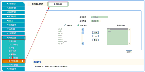3. 然后配置普通类型服务组,用于放通打开网页需要使用到的端口。如图表3