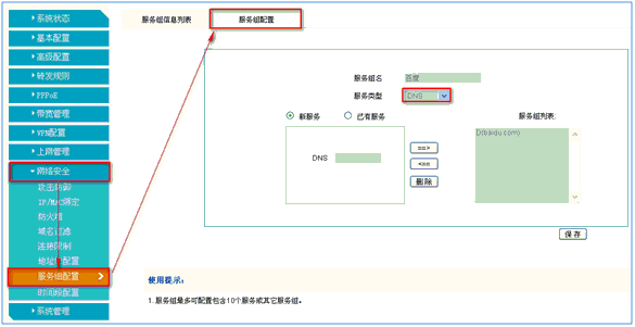2. 然后再配置DNS服务组,用于指定具体的网站。如图表2