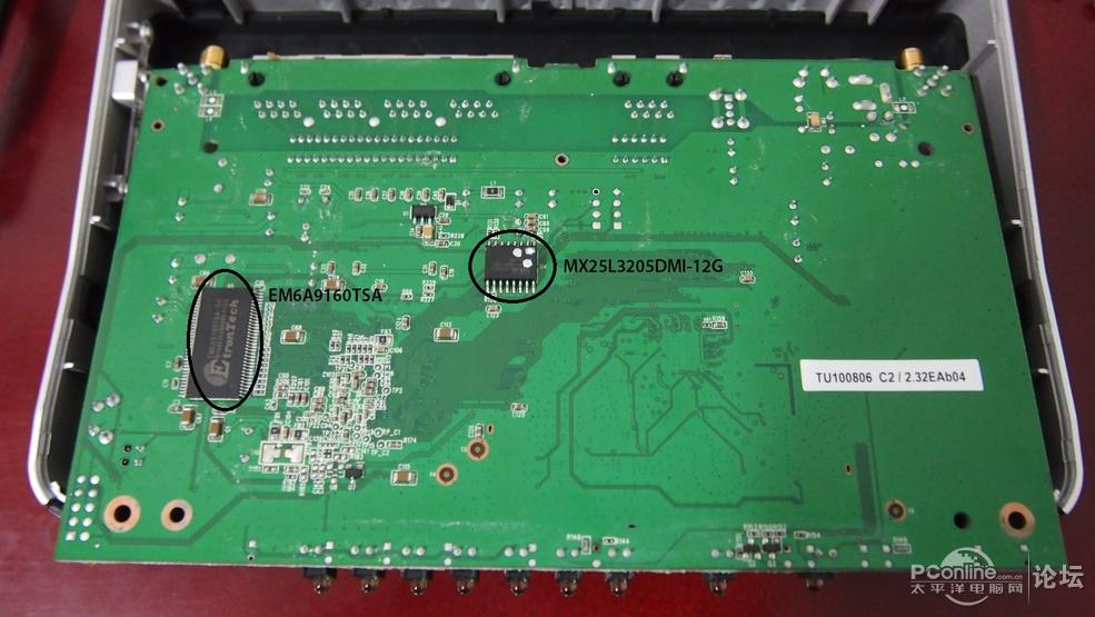 螃蟹8306G的交换芯片,无线芯片AR9223-AC1A,交换芯片上面的芯片应该是主角了,可惜被挡住了看不到。