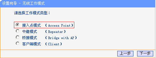 3. 选择"无线AP模式",点击"下一步",弹出"无线工作模式"选择页面。如下图所示。