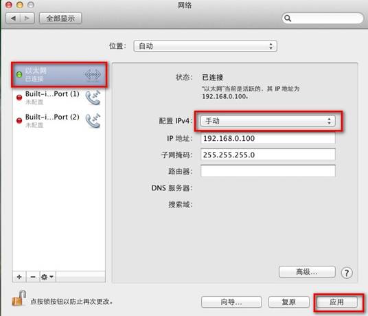 第二步 点击以太网,配置IPv4选为手动。输入IP地址为192.168.0.x,(x为2-254),掩码255.255.255.0,然后点击应用按钮。