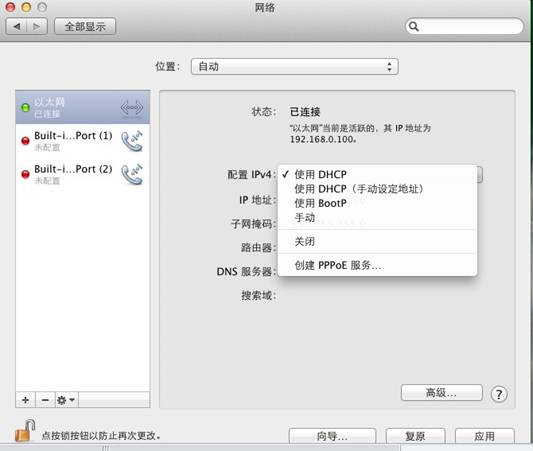 第四步 将打印服务器按照预订的使用拓扑与打印机和路由器连接好,将您的MAC电脑的IP地址改回之前的数值,例如配置IPv4改为使用DHCP或者手动指定为原来的IP地址。
