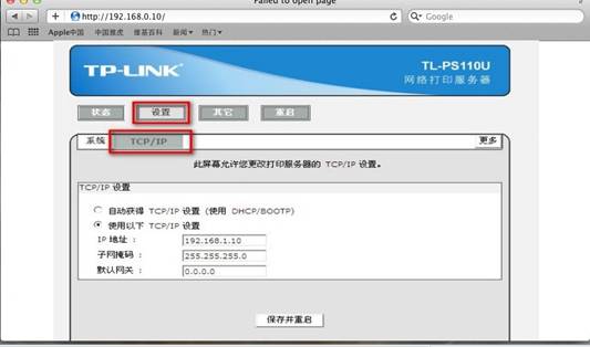 第三步 打开系统浏览器Safari,输入http://192.168.0.10回车进入打印服务器的管理界面,选择设置--TCP/IP,修改打印服务器的IP地址后点击保存并重启。