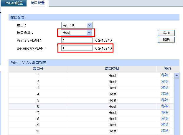 3) 将1-10号端口的端口类型设置为Host,并将其加入到Secondary VLAN 3中