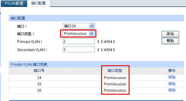 2) 在端口配置中将两个vlan的公共端口设置为Promiscuous模式,如下图所示,这样24,25,26号端口会被所有属于Primary VLAN2的Secondary VLAN所包含。