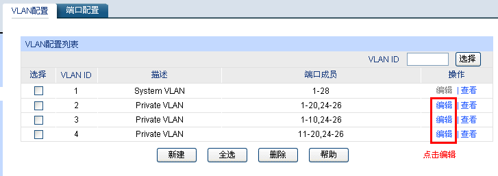 1) 进入交换机管理页面->vlan->private vlan添加Primary VLAN 2,Secondary VLAN 3,4