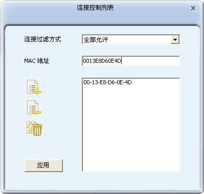 使用此功能,您可以允许或者拒绝特定的MAC地址连入AP建立的无线网络。类似于无线路由器的“无线MAC地址过滤功能”。下面介绍一下该功能的设置方法。