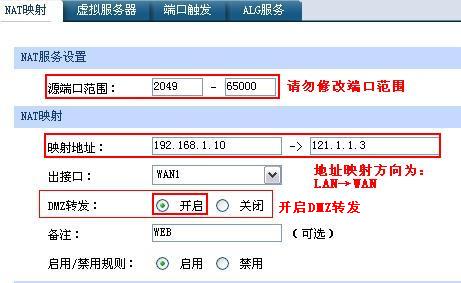 注意:需要外网访问内网服务器,请启用DMZ转发。