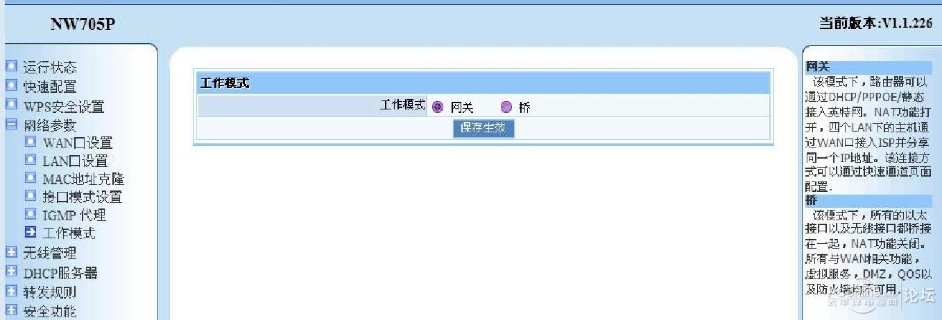 NW705P具备两种路由器运行模式:网关跟桥模式。