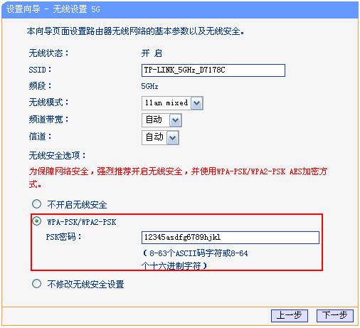 步骤五:点击“下一步”,弹出无线设置5GHz频段无线参数的界面,设置SSID、无线信道、无线安全等选项,无线安全选项推荐“WPA-PSK/WPA2-PSK”,如下图示。