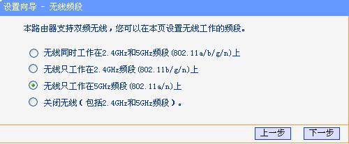 步骤四:点击“下一步”弹出无线频段设置界面。使用5GHz频段,可以选择同时开启2.4GHz和5GHz或者只开启5GHz,此例以只开启5GHz为例,选择“无线只工作在5GHz频段”,如下图示。