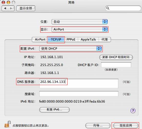 选择桌面图标“System Preferences”。在弹出的页面中选择“网络”。弹出网络连接设置页面,如下图所示,“位置”选择“自动”,“显示”选择“AirPort”,选择“TCP/IP”,即可设置无线网络参数(推荐使用DHCP)。