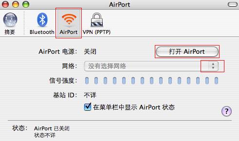 STEP2:选择“AirPort”,进入WiFi设置页面。点击“打开AirPort”开启无线开关,搜索无线信号,如下图所示。